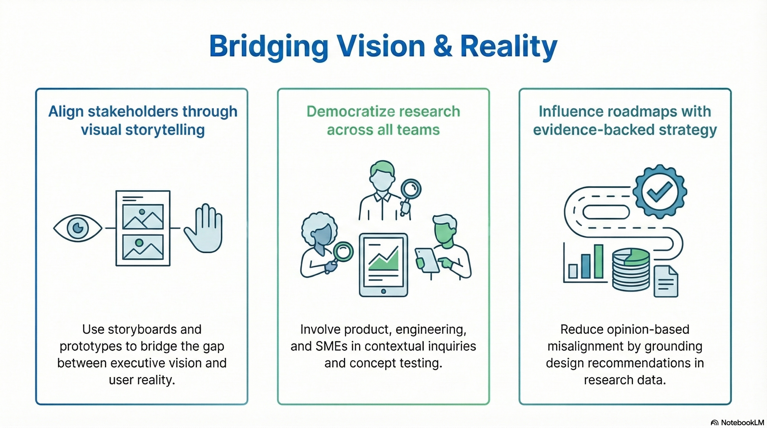 The Approach & What Made it Special: This wasn’t about redesigning a UI; it was about our team driving a cultural shift towards design-thinking across the organization. What made this initiative unique was our focus on cross-functional alignment and storytelling. To bridge the gap between C-suite expectations and user realities, I utilized unconventional artifacts—like mock press releases, storyboards, and “concept car” prototypes.