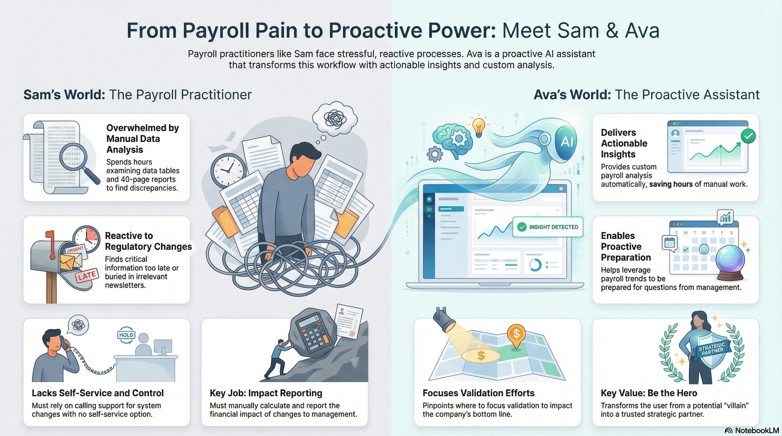 To transform Sam, an overburdened payroll practitioner, from a manual data-cruncher into a strategic business advisor with the help of an ML-driven, conversational experience.