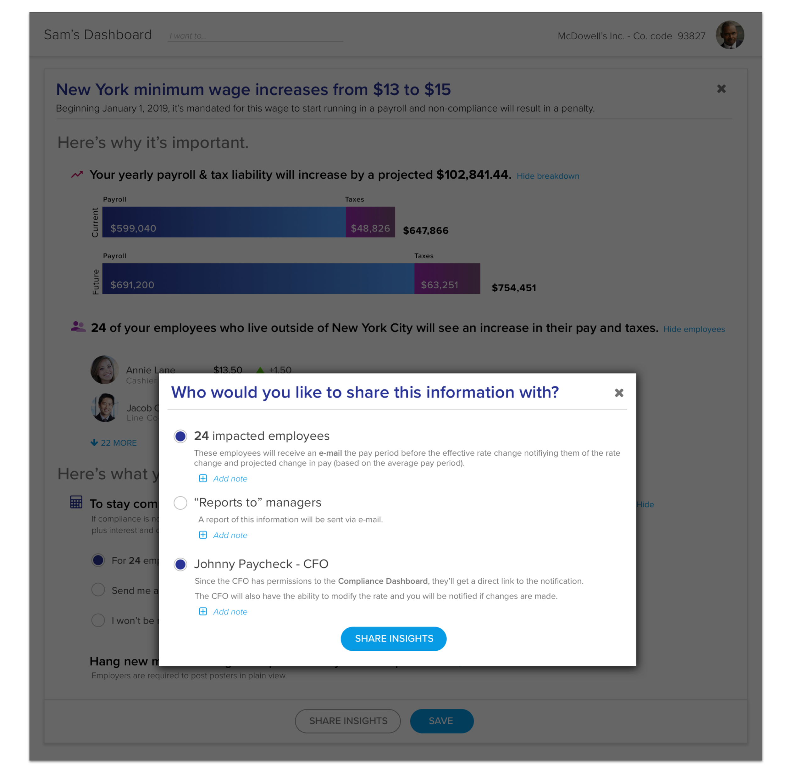 Action: Sam clicks “Share Insight” and selects the impacted employees and “Johnny Paycheck-CFO” to send out automated notifications and reports.