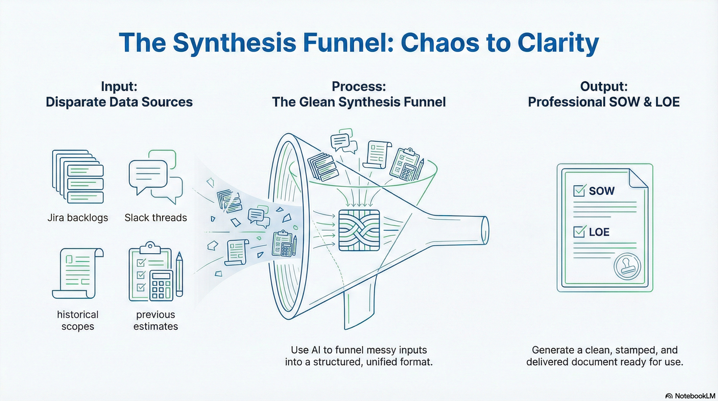 Leadership required detailed LOE (level of effort) estimations and an SOW (Statement of Work) immediately, following the loose definition of scope. Manual compilation would have taken days we didn’t have.
