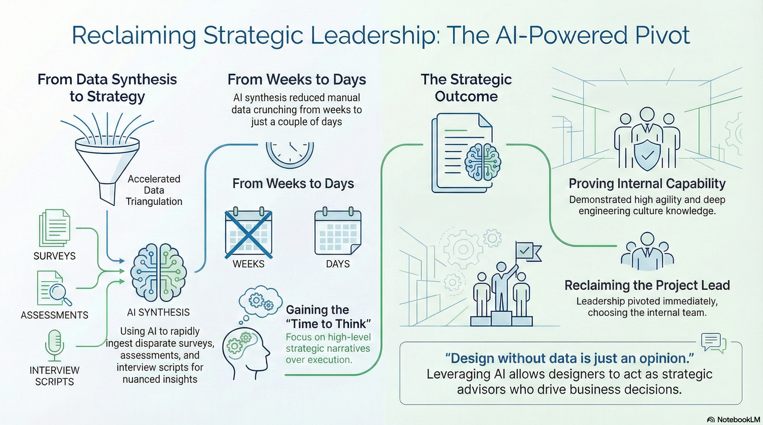 With a tight-turn around between pilot close and our readout date, I used Gemini and NotebookLM to rapidly ingest disparate data sources (surveys, assessments, impact metrics and interview scripts) so I could “query the data” to find nuanced connections between learners sentiment, assessment scores and business impact.