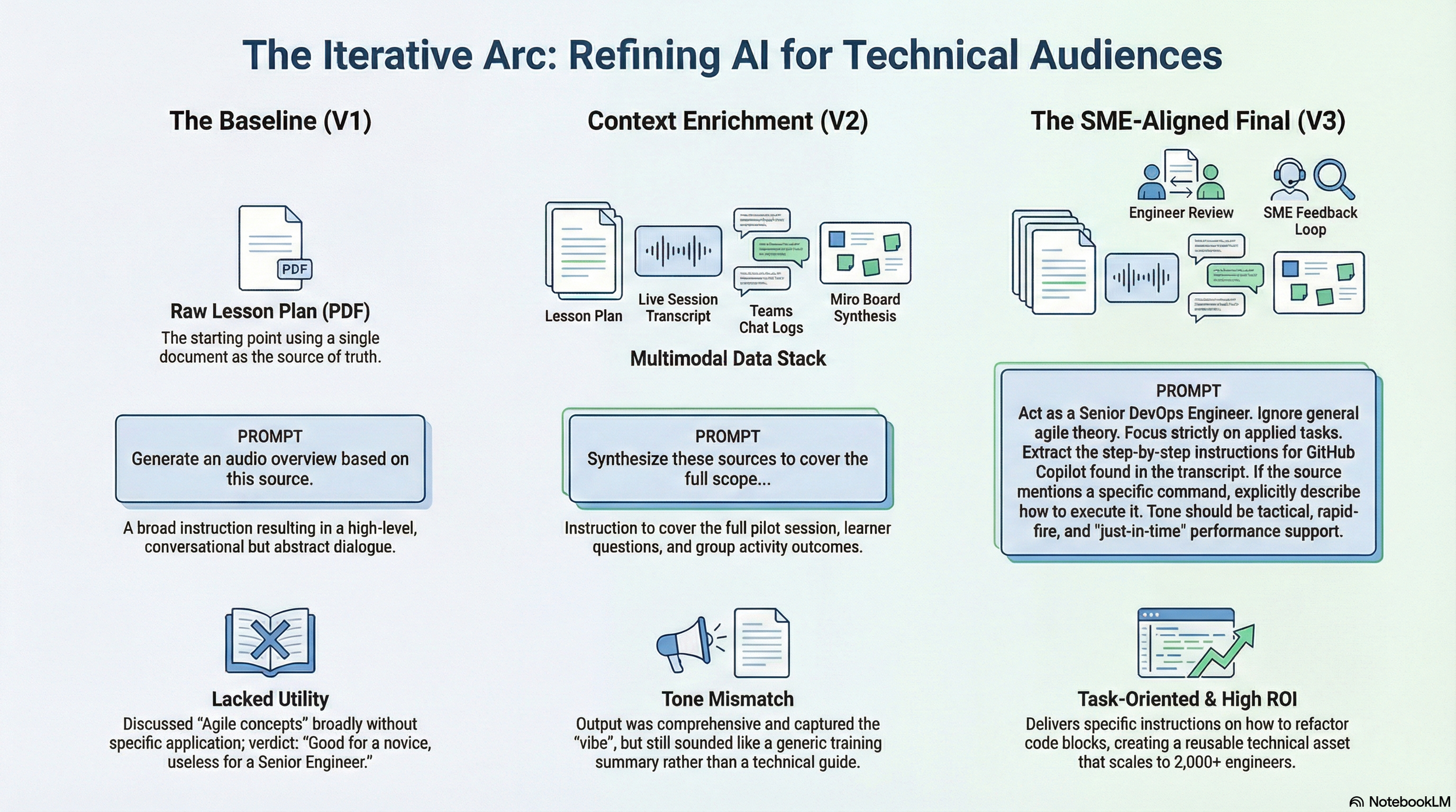 Validated Modality: Through branching surveys and post training interviews, we validated this as a viable, complementary modality to increase reach and maximize ROI. Engineers saw the NotebookLM audio overviews as an “interactive pairing buddy” that they could access at point of need during their coding work flows.