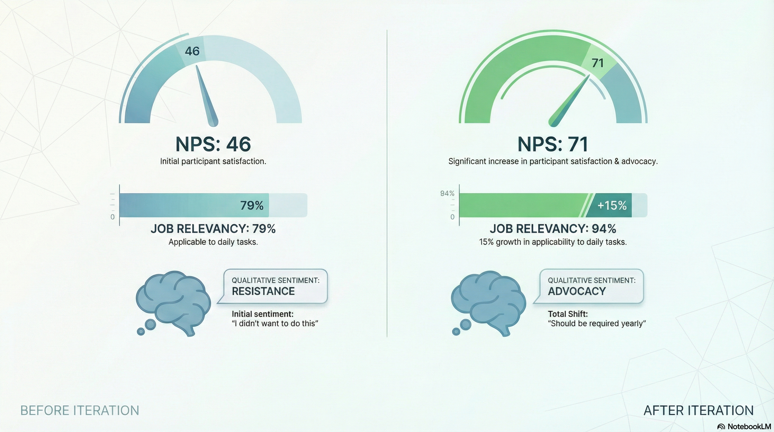 We saw a significant positive transformation in attitudes and perceived value following our shift. There was a substantial increase in advocacy as measured by a 25-point jump in the Net Promotor Score. Participants also reported that the training felt far more applicable and relevant to their roles, with relevancy ratings climbing to a near total consensus at 94%.